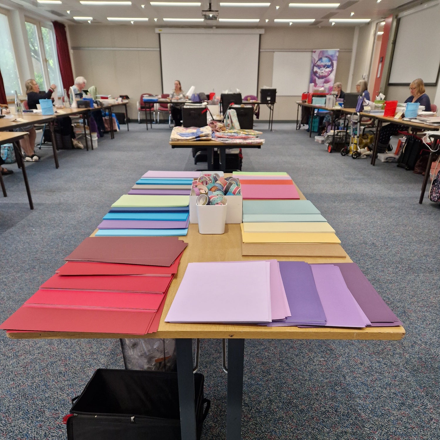 In our dedicated craft room, set out your supplies, and you don't have to pack up until you go home! You get a 5ft table to yourself, a power point, and plenty of room to arrange your supplies.